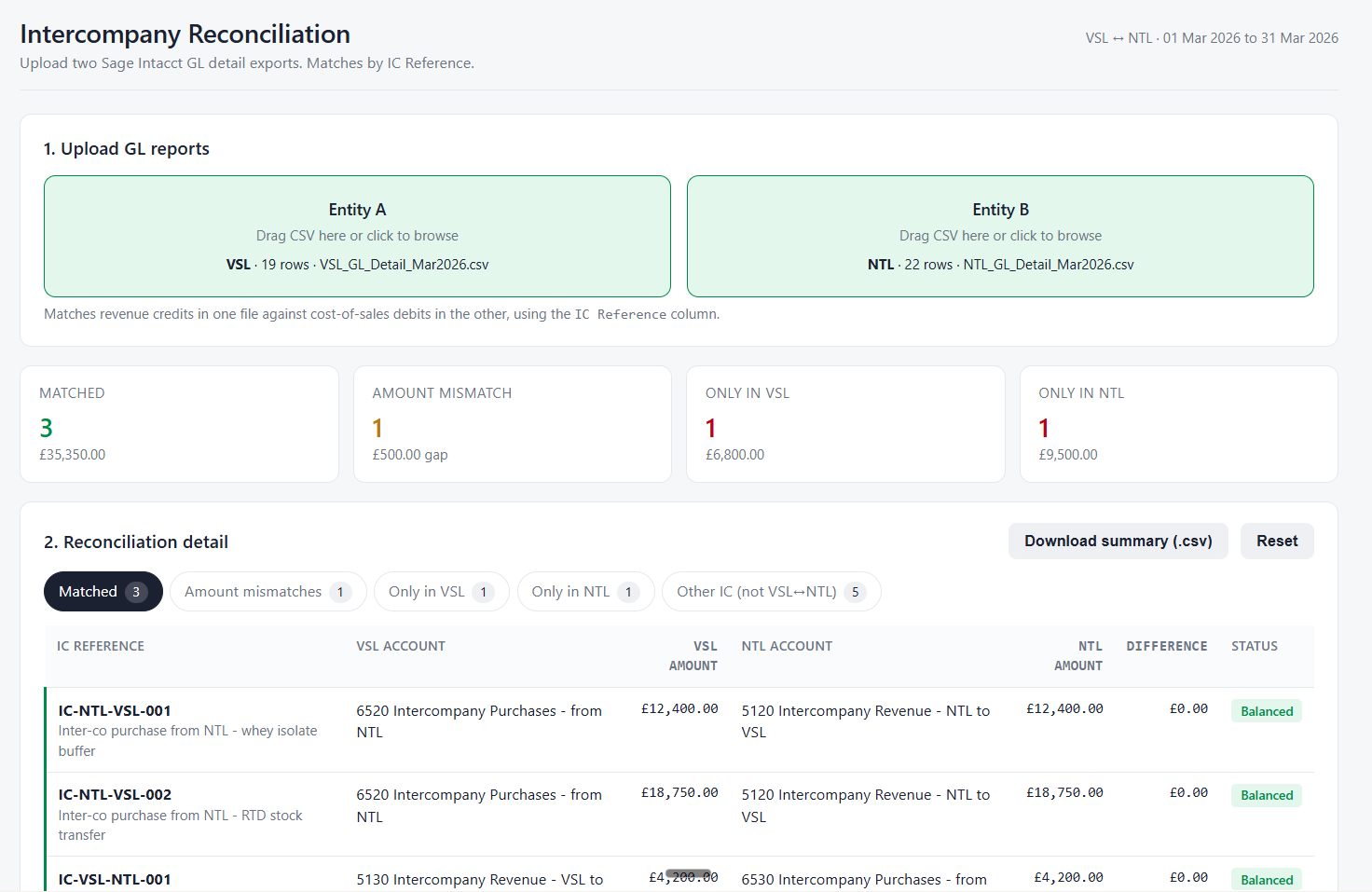 Rather than explain how this works, I wanted to show it. So I asked Claude to build a working demo on my fictitious company Thornbury Group (a UK maker of sports supplements): take two intercompany GL extracts, one for each group entity, and flag what matches, what doesn't, and where the amounts disagree. This is the kind of reconciliation finance teams grind through in Excel every month. I described what I wanted: